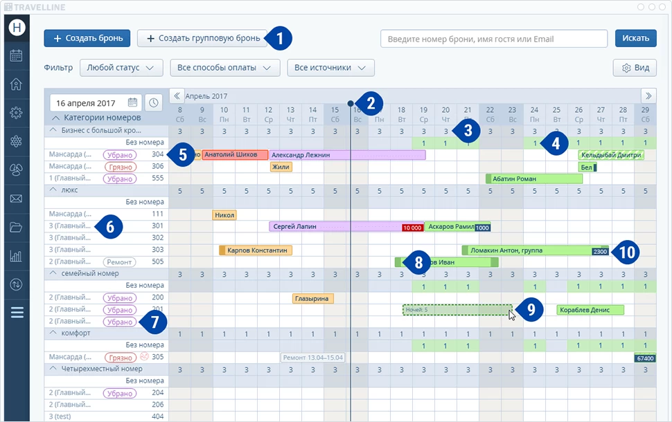 9 - быстрая бронь (бронь можно создавать в один клик, просто выделив в шахматке нужную дату и номер);
