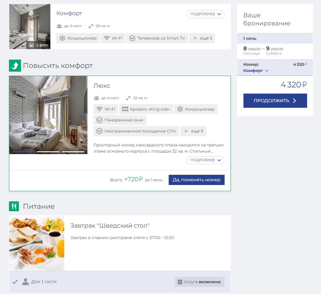 В процессе бронирования система предложит сменить номер на более комфортный или добавить дополнительные услуги, например, питание или трансфер до аэропорта. Все это позволит увеличить стоимость брони и средний чек.