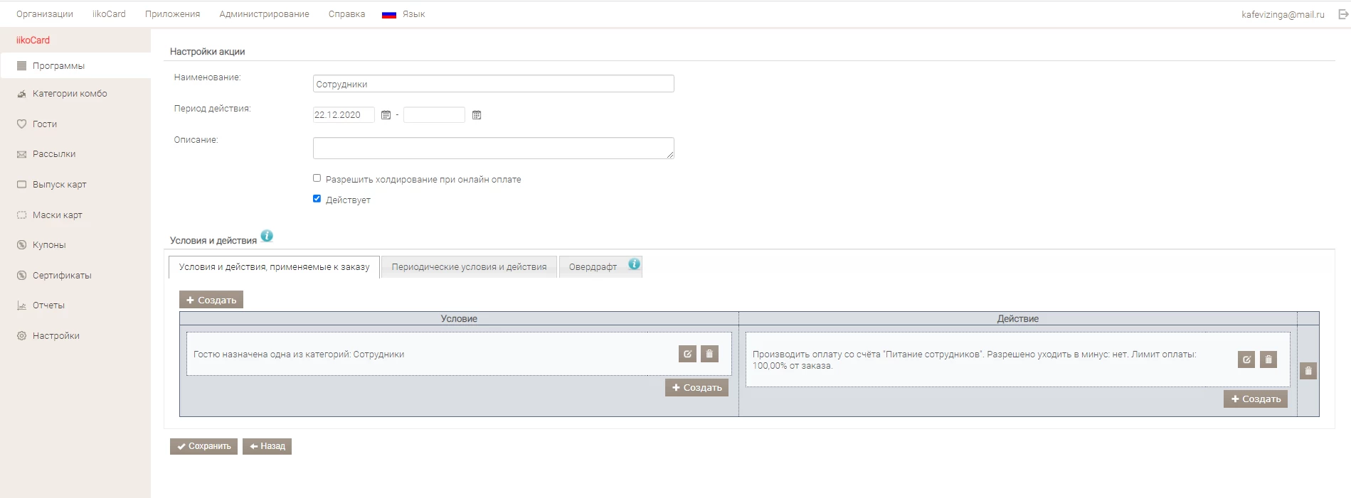Далее создается программа, в которой описывается, кто будет получать начисления, какая сумма и количество блюд. Также мы можем задать ограничение трат на месяц, сделать автоматическое начисление по определенному расписанию (начисления каждый день или раз в месяц и т.д.) или поставить СТОП на определенную группу товаров.